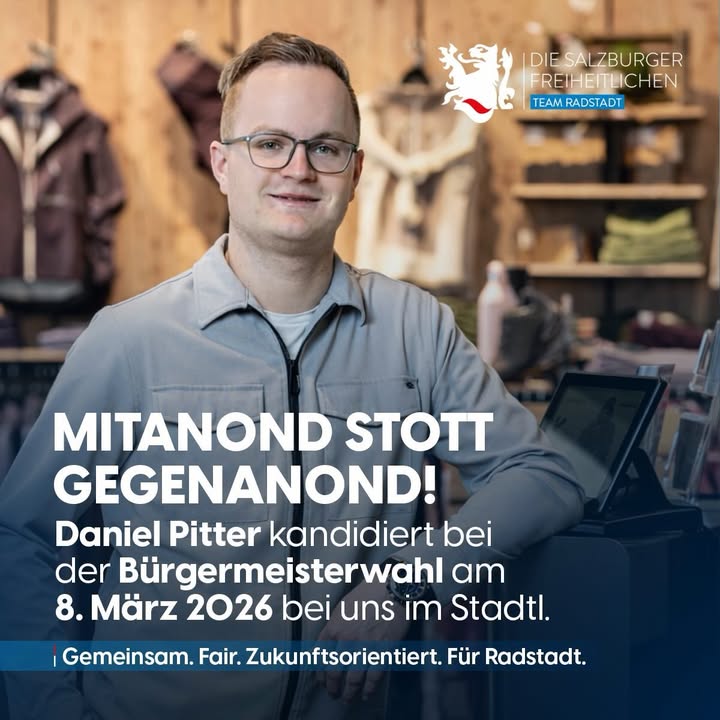 am 8. März 2026 kandidiere ich für das Amt des Bürgermeisters. Ich möchte Verantwortung übernehmen und Radstadt gemeinsam mit euch weiterentwickeln – ehrlich, bodenständig und nah an den Menschen.